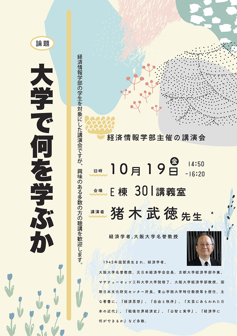 公開日 2018年09月18日 10月19日(金)、大阪大学名誉教授・元国際日本文化研究センター所長の猪木武徳先生を迎えて、「大学で何を学ぶか」という演題で経済情報学部の学生ならびに教職員、一般市民を対象に経済情報学部主催の講演会を開催します。学内外から多数の方の聴講を歓迎します。 ○日時 2018年10月19日(金)14:50~16:20(開場14:40) ○会場 尾道市立大学 E棟3階301講義室 ○申込不要 ○聴講無料 ※大学内の駐車スペースには限りがございますので、可能な限り公共交通機関をご利用ください。