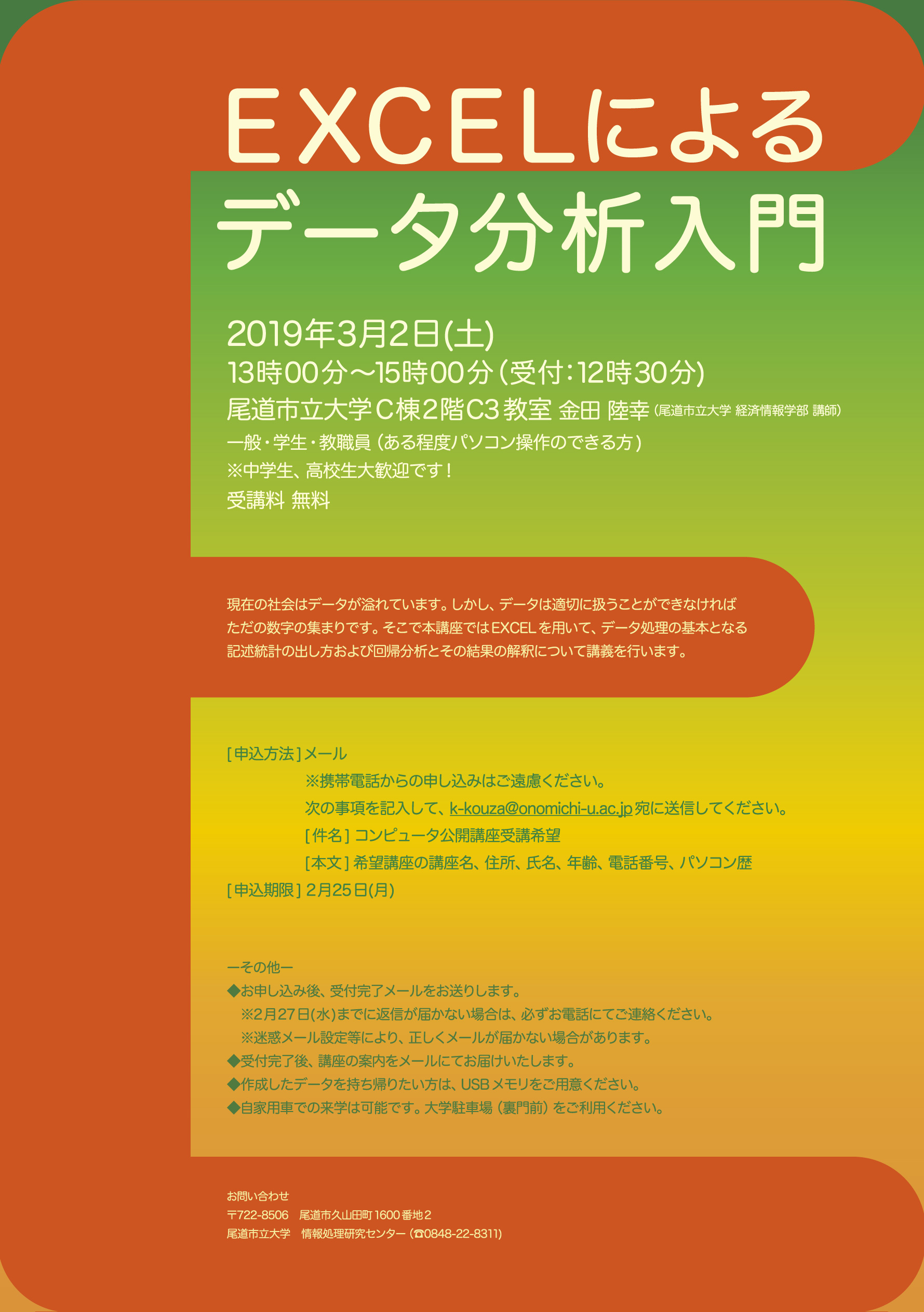 ○内容:現在の社会はデータがあふれています。しかし、データは適切に扱うことができなければただの数字の集まりです。そこで本講座ではEXCELを用いて、データ処理の基本となる記述統計の出し方および回帰分析とその結果の解釈について講義を行います。
