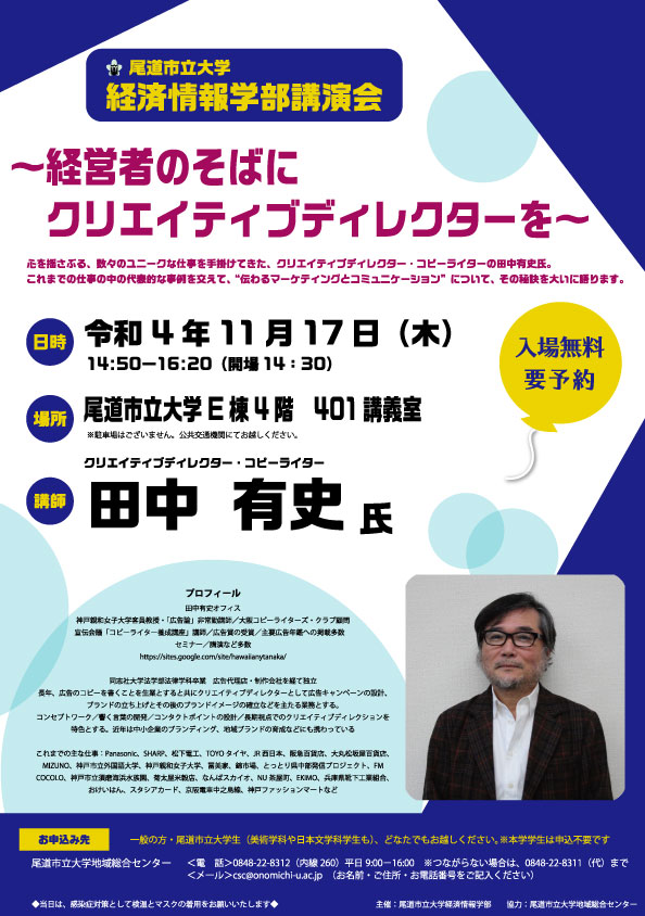 11月17日(木)、クリエイティブディレクター・コピーライターの田中有史先生を迎え、本学学生ならびに教職員、一般市民を対象に経済情報学部主催の講演会を開催します。経済情報学部生だけでなく、美術学科や日本文学科の学生、一般の方も是非お越しください。