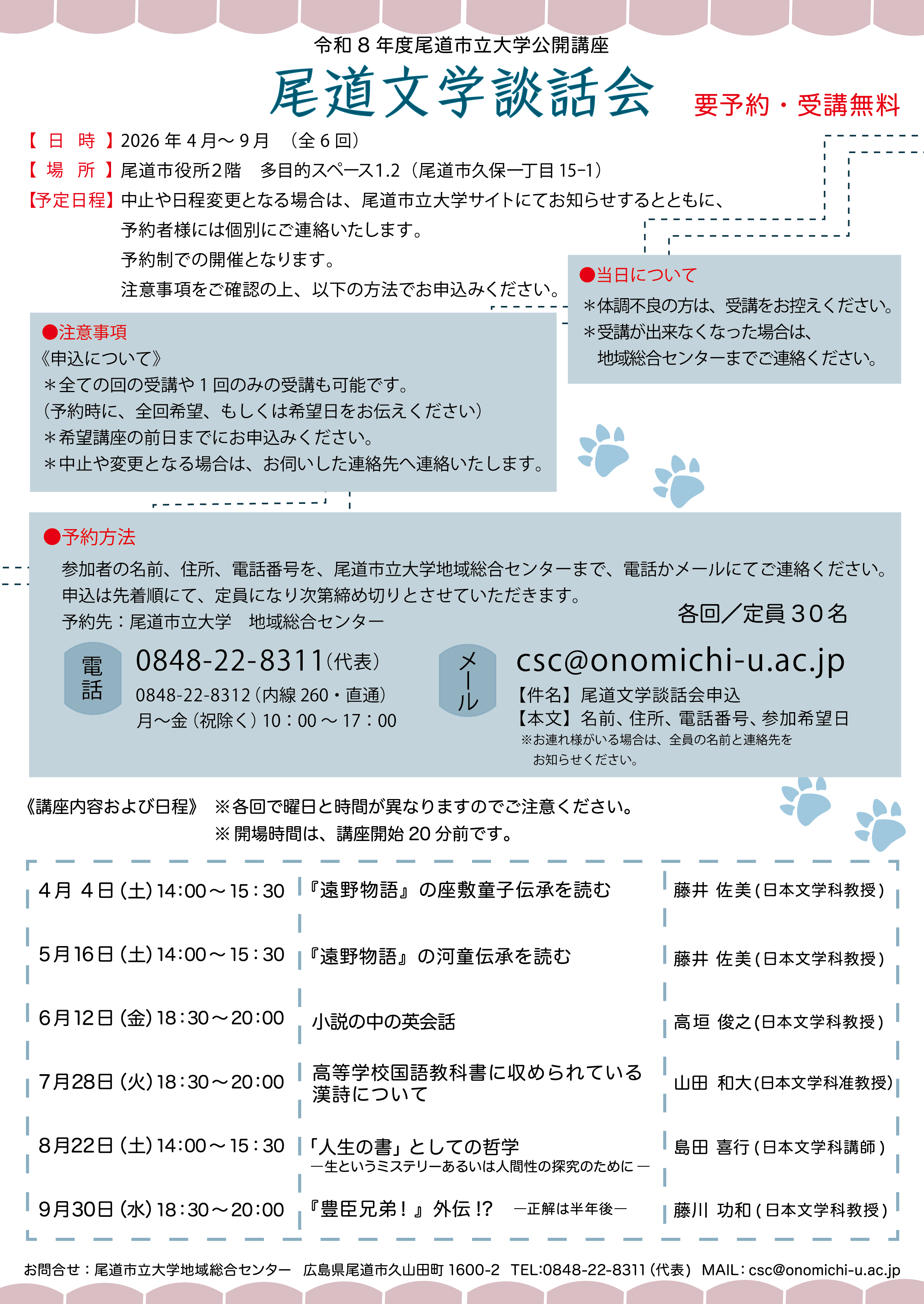 日本文学科を中心とした本学の教員が、文学や言葉にかかわる様々な話題を提供し、市民の皆様と談話形式で講義を行う公開講座「令和8年度 尾道文学談話会」を以下の日程及びテーマで開催します。