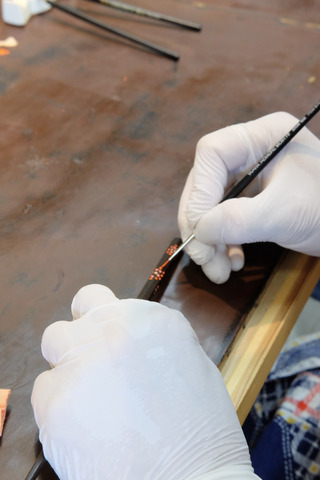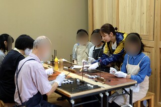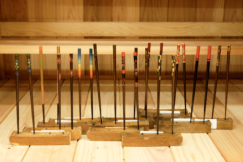 あらかじめすり漆を重ねた箸に色漆で自由に絵付けをしていただきました。