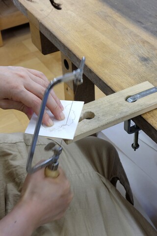 厚紙にデザインを描き、糸ノコで切っていきます。そして厚紙を木で押さえ、切り抜いた厚紙部分に熔かしたスズを流し込みます。