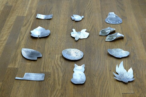 時間をおくとスズが固まり、糸ノコで切り取った形が出来ます。その後、箸が置きやすいよう金づちで丸みをつけ、ブラシで磨き、素敵な箸置きが完成しました。