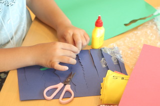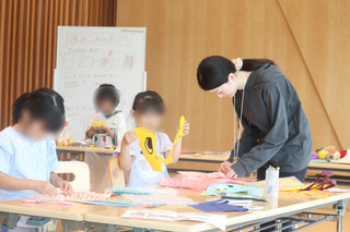 28日に開催された「あみこみのおうち」では、はさみで切った画用紙の隙間にプチプチの緩衝材や毛糸、紙袋やチラシの絵柄を切ったもの等を編み込んで、自由な発想で思い思いのおうちを作っていきました。優しく見守り共に制作を楽しむ中部さんに、子どもたちも笑顔で制作を行っていました。
