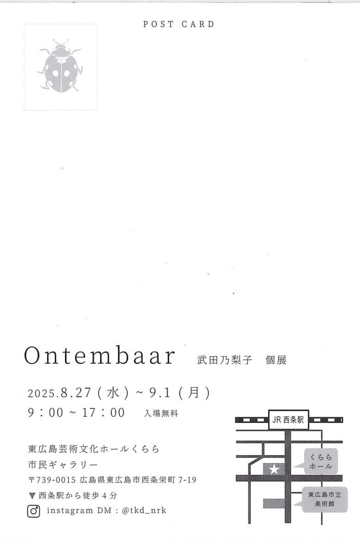 公開日 2025年08月05日 武田乃梨子さん(本学美術研究科絵画研究分野日本画2年) の個展が東広島市で開催されます。 『Ontembaar 武田乃梨子 個展』 会期:2025年8月27日(水)〜9月1日(月) 9:00〜17:00 入場料無料 会場:東広島芸術文化ホールくらら 市民ギャラリー 〒739-0015 東広島市西条栄町7-19 お問い合わせ 美術学科
