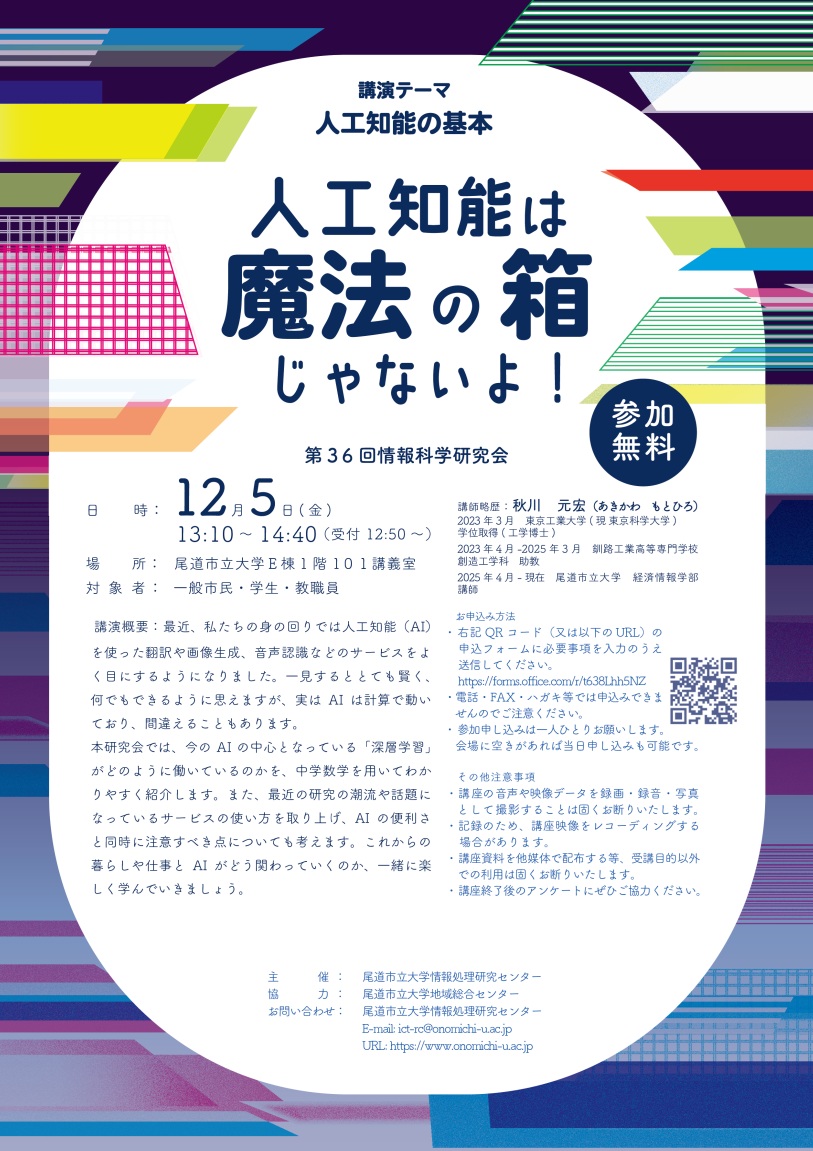最近、私たちの身の回りでは人工知能(AI)を使った翻訳や画像生成、音声認識などのサービスをよく目にするようになりました。一見するととても賢く、何でもできるように思えますが、実はAIは計算で動いており、間違えることもあります。本研究会では、今のAIの中心となっている「深層学習」がどのように働いているのかを、中学数学を用いてわかりやすく紹介します。また、最近の研究の潮流や話題になっているサービスの使い方を取り上げ、AIの便利さと同時に注意すべき点についても考えます。これからの暮らしや仕事とAIがどう関わっていくのか、一緒に楽しく学んでいきましょう。