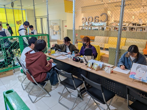 本学では、美術研究科藤川愛さん、美術学科梅野壮真さん、松本春花さんの3名が似顔絵制作を行いました。親子連れや友人同士、他ブースの学生や先生からも依頼をいただき、約40名の似顔絵を制作しました。