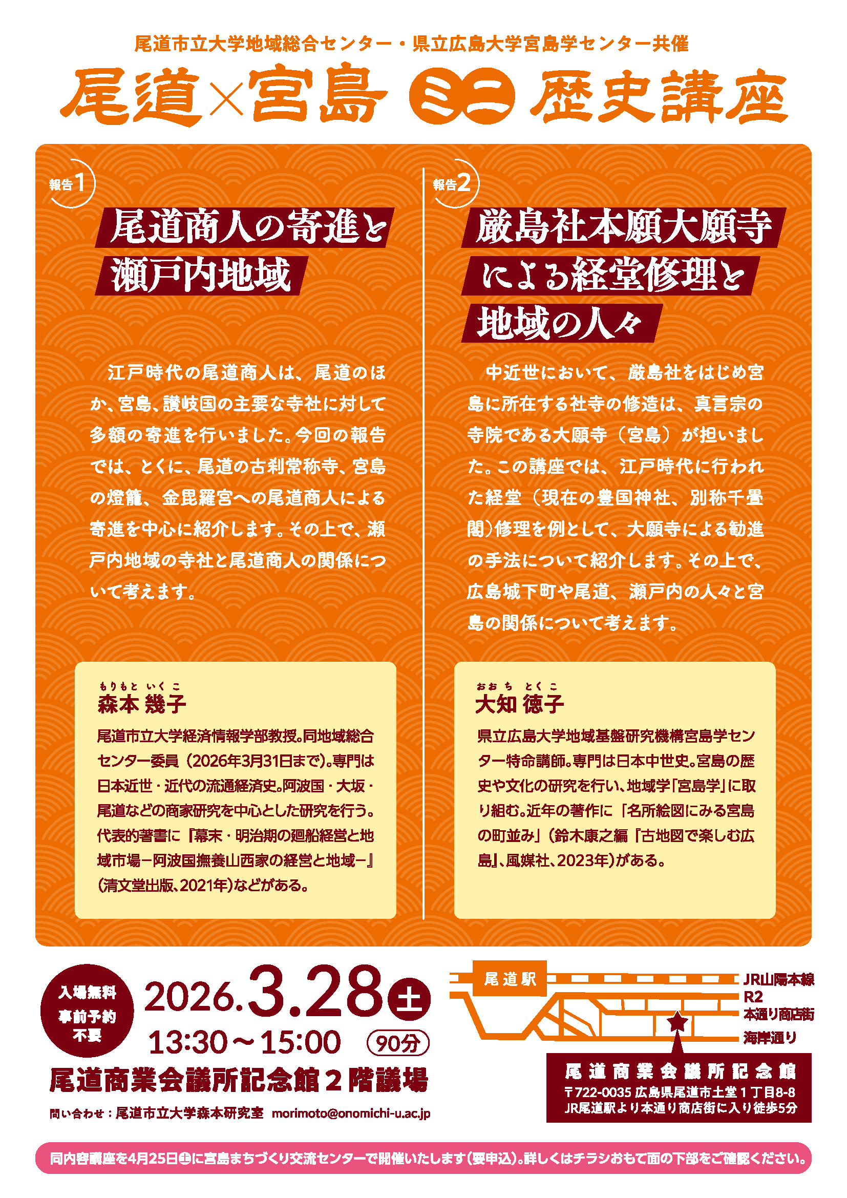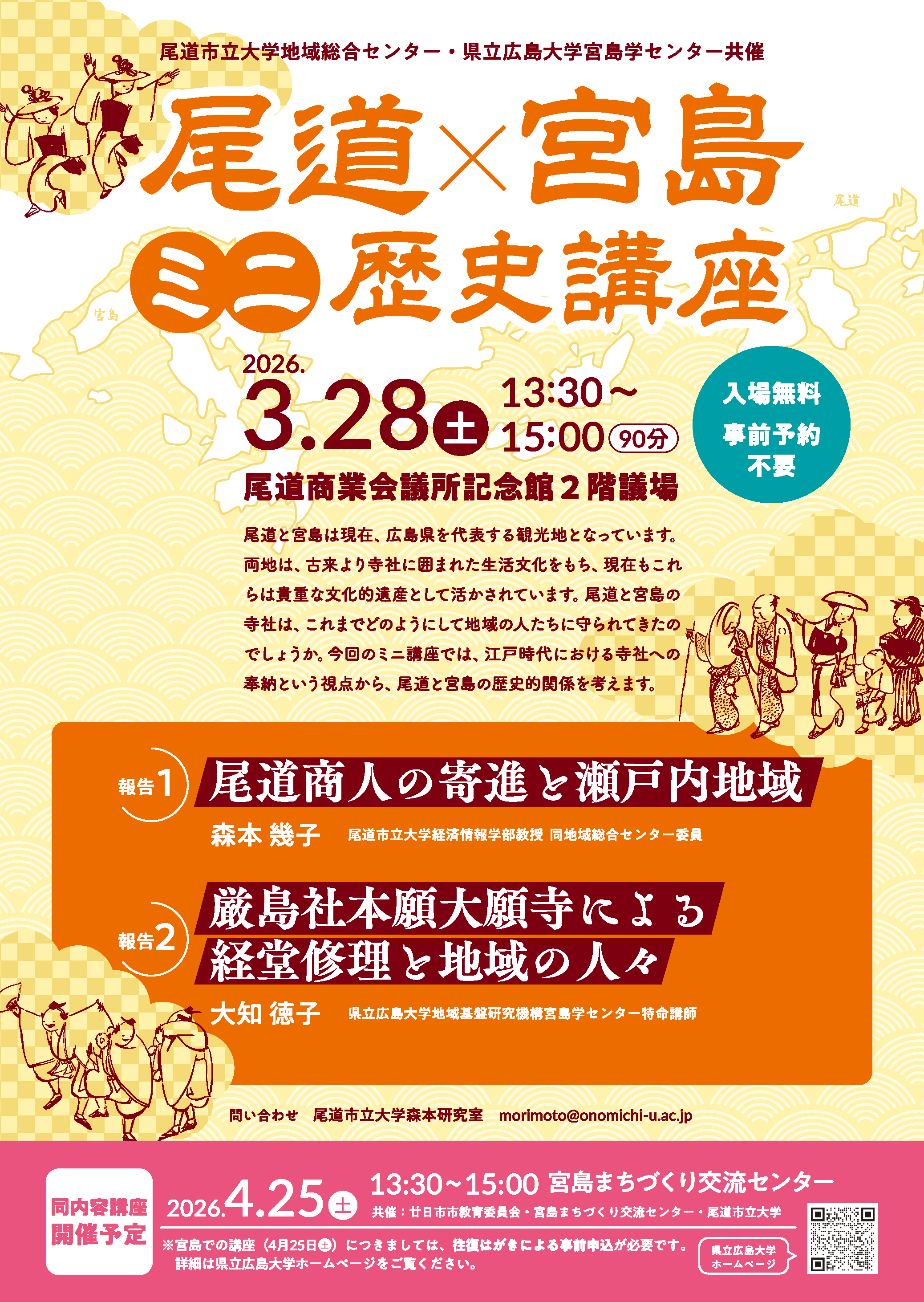 尾道市立大学地域総合センター・県立広島大学宮島学センター共催の公開講座「尾道×宮島 ミニ歴史講座」を開催します。