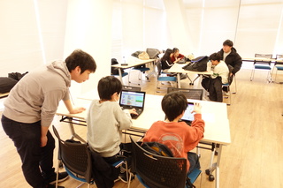 参加した1年生の住久彰さんは、「それぞれの段階が違うからこそ言葉遣いや習っている内容に配慮しつつ、説明を繰り返すことで参加している児童さんの作品が少しずつ形になっていくことに感動しました。」と、小学生の自由な発想や想定外の状況にとまどいつつも奮闘し、一緒に作品を作っていきました。小学生のイメージをプログラムで実現するお手伝いができ、学生たちも充実した経験ができました。
