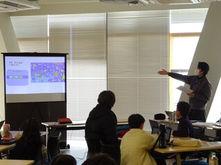 今回は、ビジュアルプログラミング言語の「Scratch(スクラッチ)」を使って「魚釣りゲーム」を作ってもらいました。初日(2月1日)は、学生が準備した「魚釣りゲーム」を段階を踏んで説明し、少しずつプログラムを作っていきました。初日の終わりには魚釣りゲームをひととおり作り上げました。